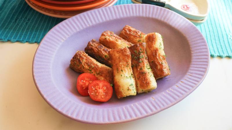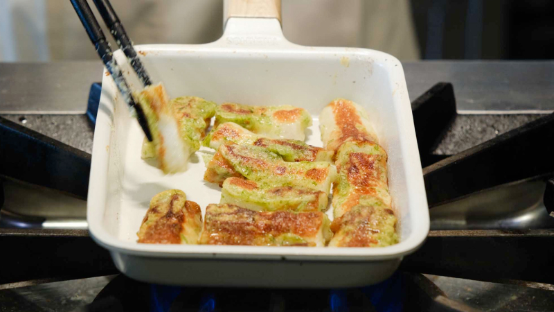 ちくわの磯辺揚げは、米粉を使うことでパリパリ感が楽しめます。さらに、ふっくら仕上げるため和え衣にマヨネーズを少量加えるのもポイントのひとつ。少ない油で揚げ焼きにするので、油の処理も不要です。