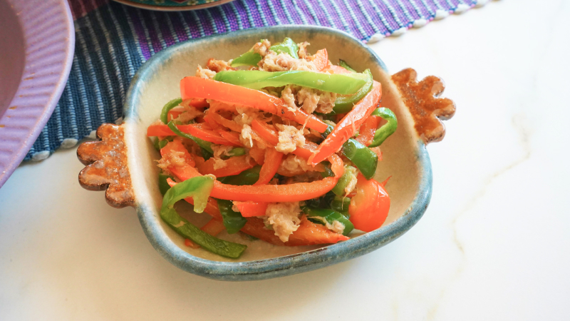 赤パプリカとピーマンの入ったきんぴらは彩りがよく、お弁当のスキマ埋めにも最適。おかずカップに分けて冷凍もOKなのだそう。