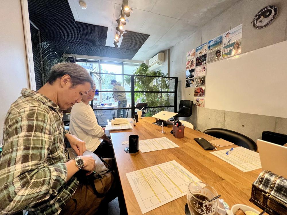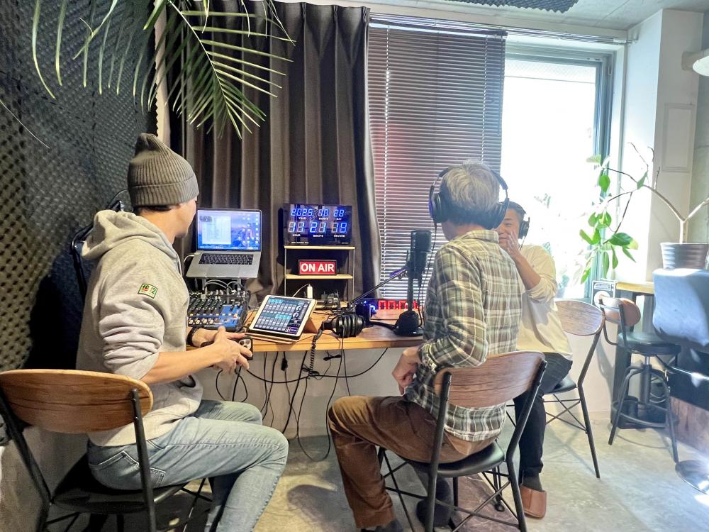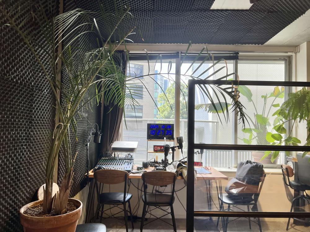 収録日はよく晴れた日で、訪日外国人ばかりの原宿の街を、待ち合わせ場所まで気持ちよく歩きました。神宮前ラジオのスタジオは通りからちょっと入った、とある建物の一室です。到着すると二人の方が出迎えてくれました。一人は神宮前ラジオの代表者・秋場さん。もう一人は新人の女性エンジニアさんです。挨拶を済ませると早速収録の打ち合わせを始めました。秋場さんはご自身もラジオDJとして全国を飛び回っており、エンジニア側として収録にあたるのは久しぶりとのこと。光栄です。