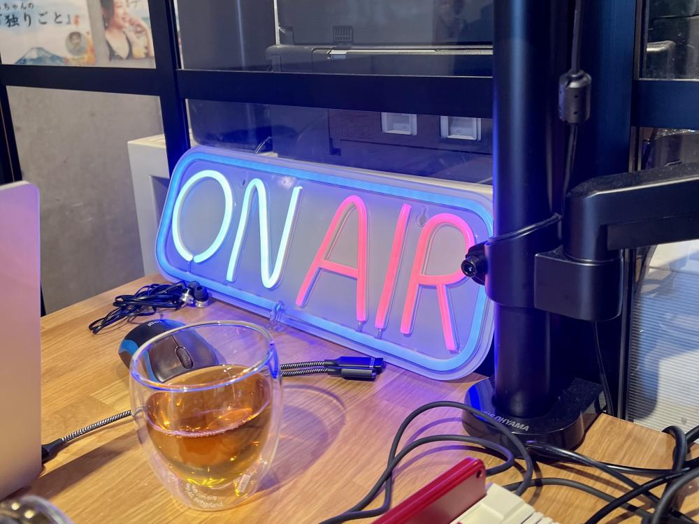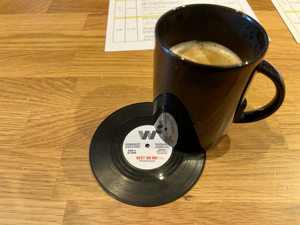 僕の店について説明を始めたら、秋場さんは店の前をよく通っていたことが判明!地元に共通の知り合いがいることも分かり驚きました。と、ここで出された飲み物のコースターを見て更にビックリ!当店と全く同じレコード柄のコースターでした!全て単なる偶然なのですが、シンクロして何かが起こるこの感覚、久しぶりです。必要な打ち合わせを済ませると、程なくして収録席へと招かれました。ヘッドフォンを着用しマイクが向けられると、音声の調整や確認があり、いよいよ収録の始まりです。タイマーが動き始め、ジングル音(放送局名や番組名をコールする短いメロディ)が聞こえてきました。