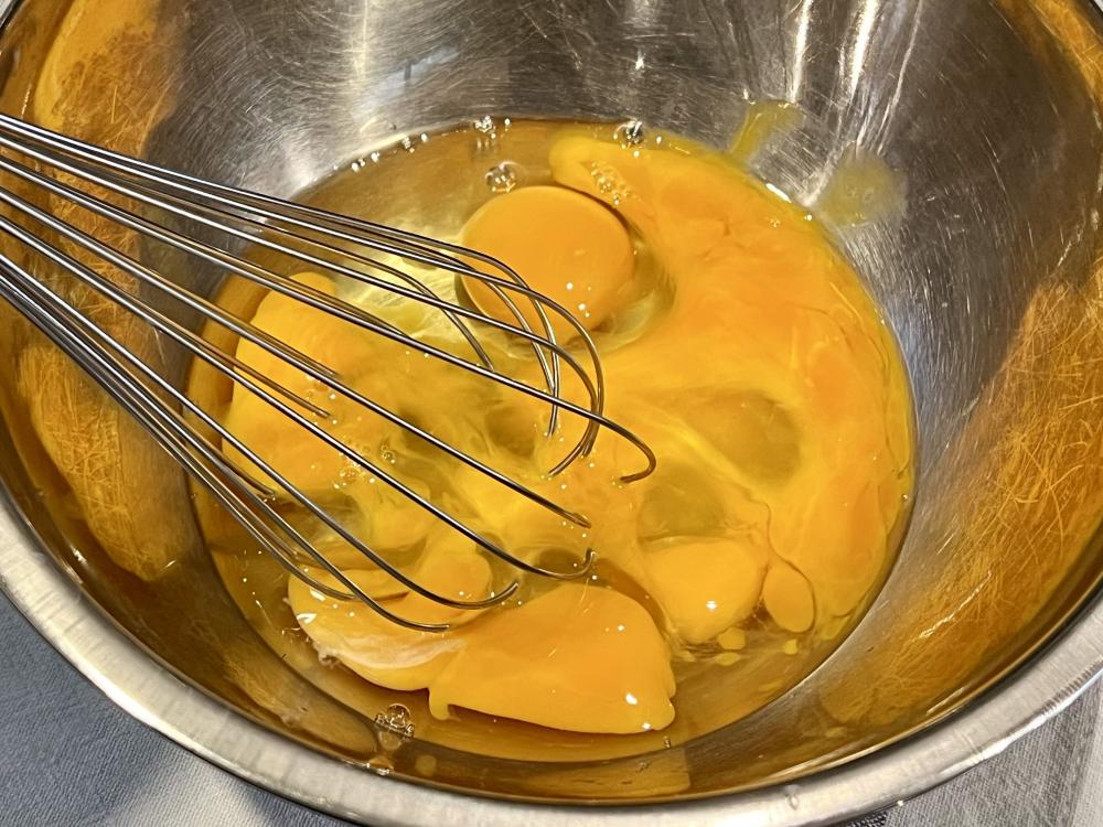 当時自分なりに好みの味わいを求めてアレコレ試した結果、オリジナルのレシピが決まりました。でも実はその後もちょっとずつ見直しをしていて、改良を続けてきました。作るほどに難しさを感じるようになって、たとえば卵のかき混ぜ方一つとっても、泡立て器をどうやって動かすかとか…。どうも数値では表せないような瑣末なところで、結構な違いが生じているんじゃないかと思えてくるんですね。ハマってますね…危険危険。