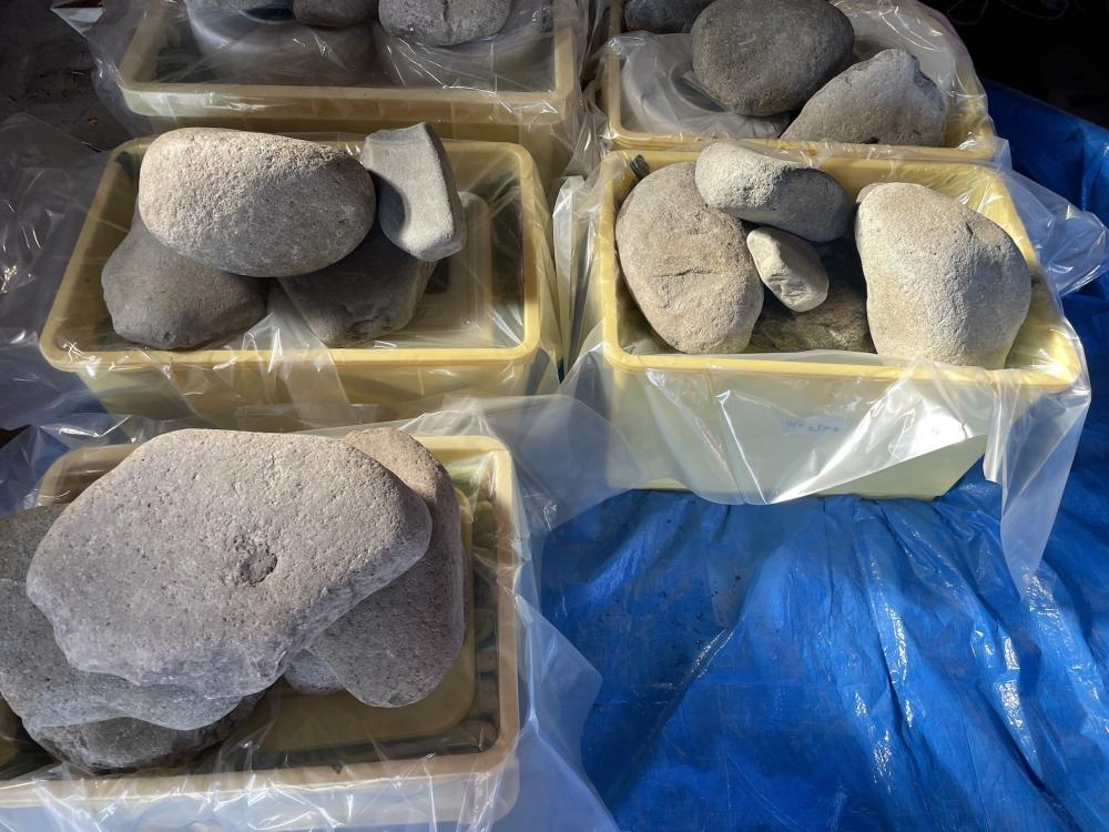 野沢菜漬けには重石が欠かせません。重石の基本は漬ける野沢菜の2倍量。つまり今年は600kgの重石です。思わず笑ってしまう重さです。購入すると比較的高い重石ゆえ、参加メンバーが河原に行って拾ってきてくれました。