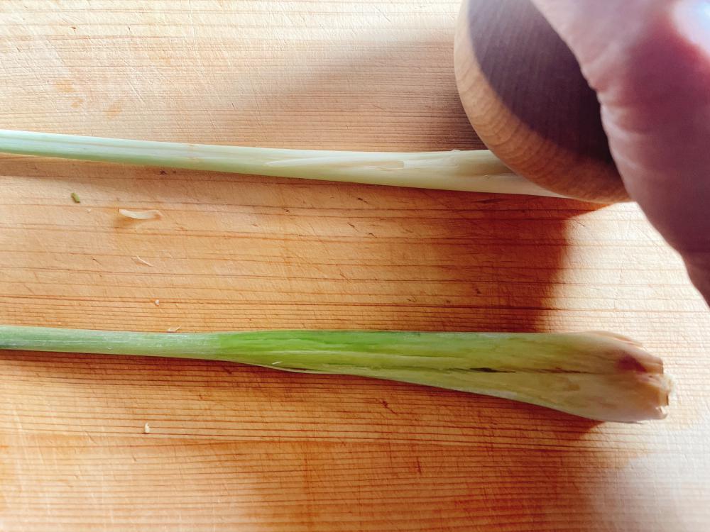 レモングラスは茎を瓶や麺棒などで叩いて香りを出し、みじん切りにします。バイマックルー(生の場合)は、中央の芯を取り除いてからみじん切りに。