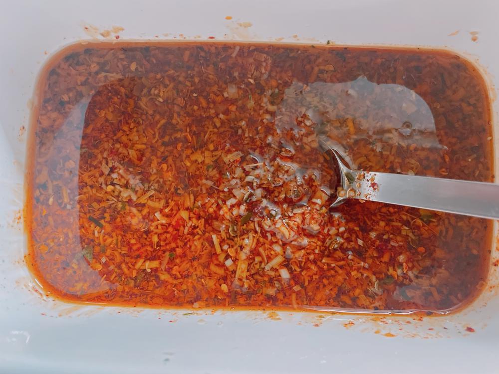 私のラー油は、油をカンカンに熱さないのが特徴です。なぜなら熱すぎる油を注ぐとレモングラスやバイマックルーの香りが飛んでしまうことと、できるだけ油は酸化させずに食べたいからです。他のラー油の作り方とは違いますのでご承知おきくださいませ。