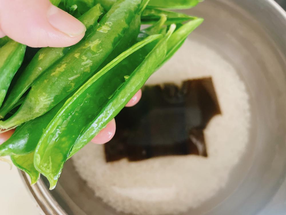 | ⑥ | 鍋または炊飯器にだしを入れ、あれば昆布とさやを上にのせて炊飯する。