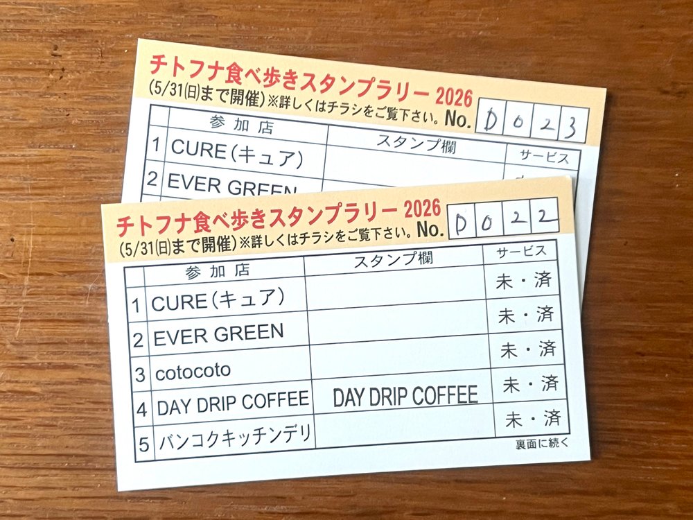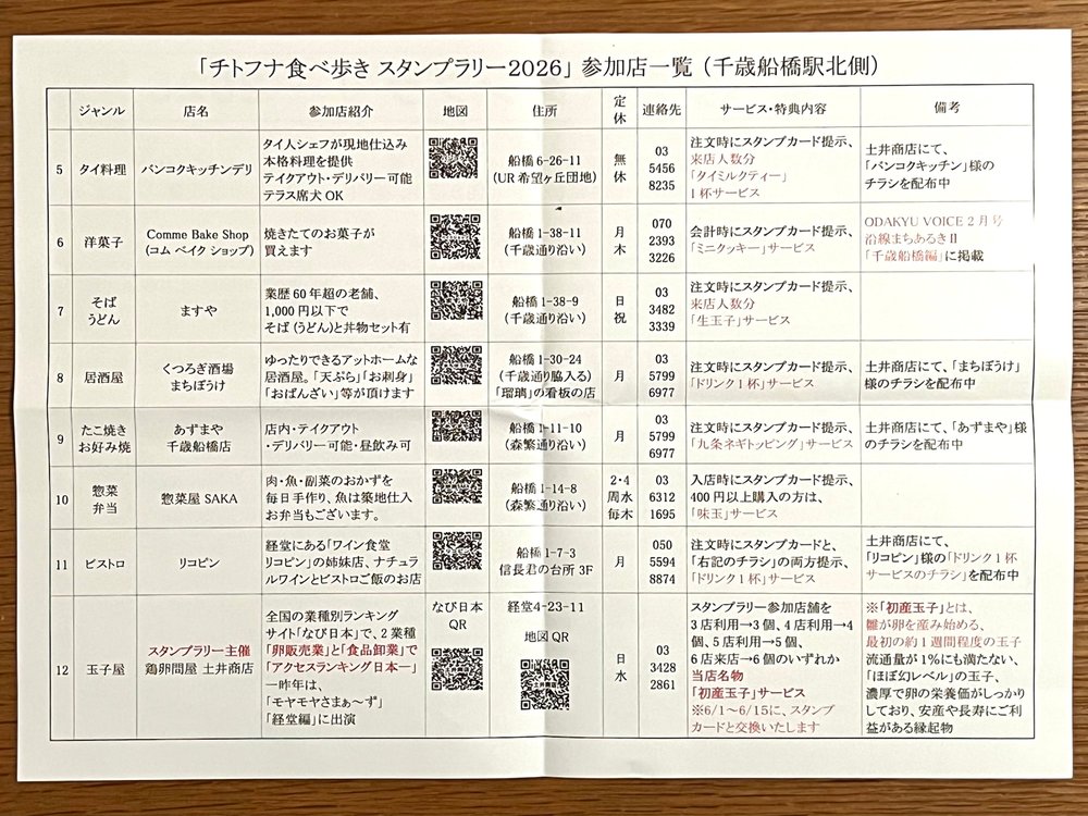僕の店がある世田谷・千歳船橋では、只今ちょっと面白いスタンプラリーが開催されています。『チトフナ食べ歩きスタンプラリー2026』と題されたイベントで、小田急線 千歳船橋駅周辺の飲食店など合計12店舗が参加しています。参加店舗の利用時にスタンプカードを提示すると、各店舗ごとのサービスや特典が受けられるというものです。僕の店では今回のために特別に用意した「ミニサーターアンダギー」を一つ差し上げています。元々スイーツの定番メニューに、沖縄の郷土菓子サーターアンダギーがありまして、そのミニバージョンという訳です。