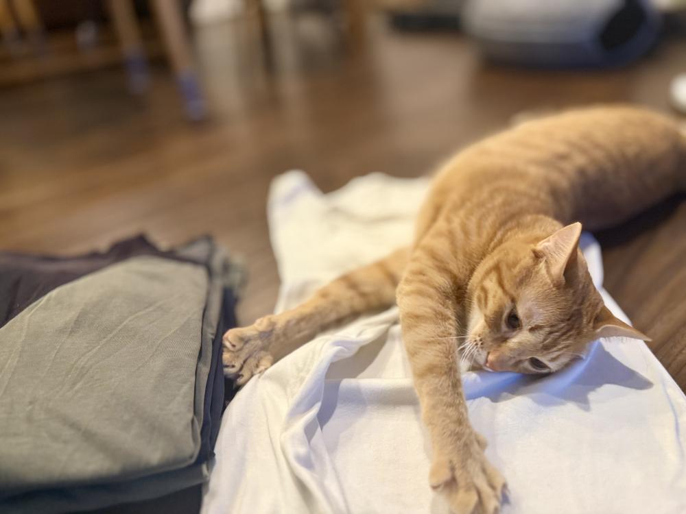 ちなみに、洗濯物をたたむのは、猫の手を借りています。